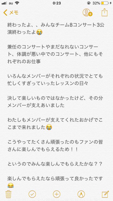 苦しい時もよくわかんない時も辛くても何かを覚えられなくても、メンバーが元気にしてくれて一緒にいるだけで笑顔になれて楽しかった〜!みんなよく頑張ったよ。。もっと辛いことがこれからあるとしてもチーム8のメンバーと一緒に乗り越えられるなら頑張れます!!!やっとちゃんと寝れる😢