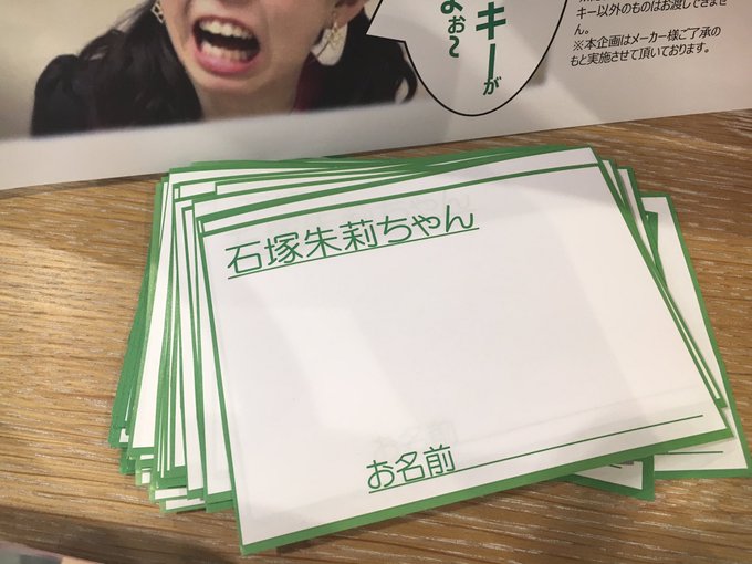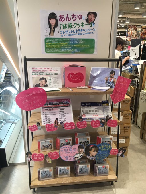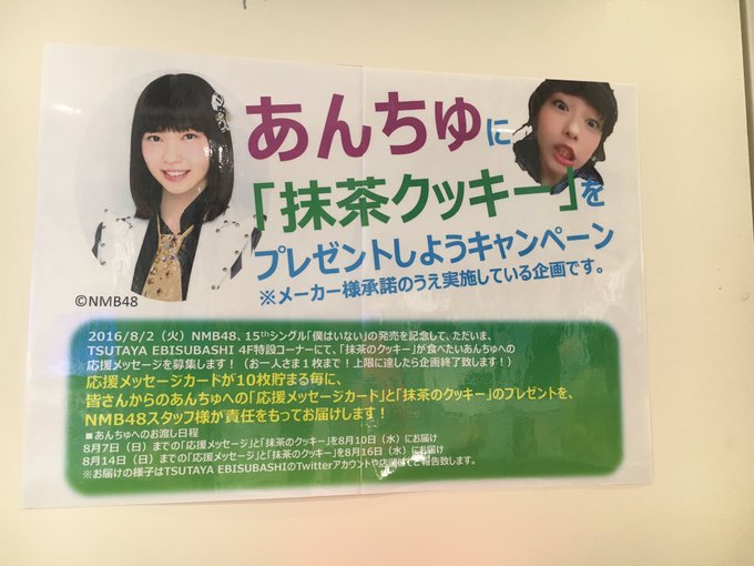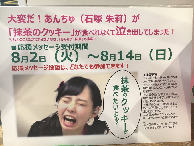 上西恵@jonishi3 -- 素敵!あんちゅかわいい! twitter.com/t_ebisubashi/s… TSUTAYA EBISUBASHI 【4F エンタメフロア】そして本日よりスタートあんちゅに応援のメッセージを書いて、抹茶のクッキーをプレゼントしよう!💚🍪💚ということで10名のメッセージが集まるごとにあんちゅに抹茶のクッキーを食べていただきます!!#石塚朱莉 pic.twitter.com/f7PAyu5u8x