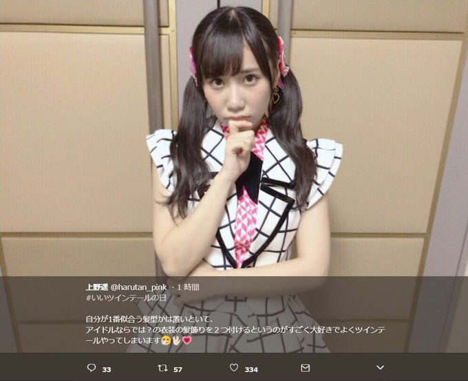 上野遥@harutan_pink -- #いいツインテールの日 自分が1番似合う髪型かは置いといて、アイドルならでは?の衣装の髪飾りを2つ付けるというのがすごく大好きでよくツインテールやってしまいます🤧🖖🏻💗 pic.twitter.com/KSHt8S6Kng