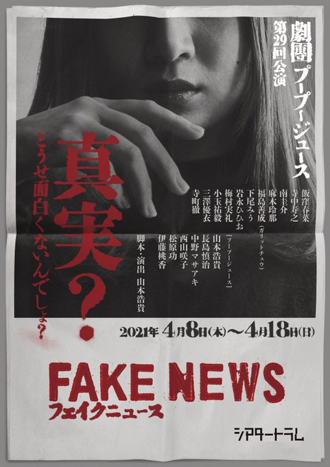 下尾みう@miumiu_0403 -- 念願の初舞台です‼️気合十分。みなさんお待ちしてます😌 twitter.com/pupujuice/stat… 劇団PU-PU-JUICE 【公式】 💥公演情報解禁💥 ◥劇団プープージュース 第29回公演『フェイクニュース』◣シアタートラム 2021/4/8(木)〜4/18(日)作・演出:山本浩貴前売:6,500円先行2/21(日)12:00〜一般3/7(日)10:00〜👇詳しくはHPをご覧ください👇pu-pu-juice.com/fakenews pic.twitter.com/tn7RtIJJtk