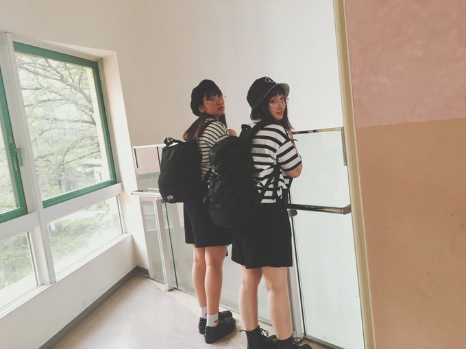 中塚智実@tmm_n0618 -- 今日の私たち。ボーダーにハーフパンツ。デニムのジャケット。丸メガネ!事前打ち合わせありだけど、これだけ持ってるもの被るかね。仲良しすぎ〜。😨 pic.twitter.com/bH1kgpuaBE