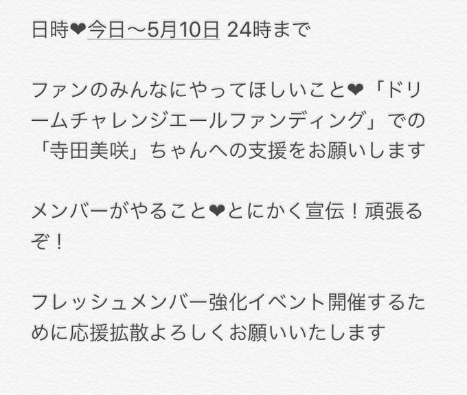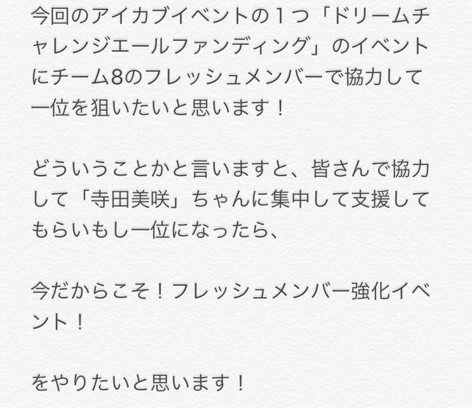 中野郁海〈AKB48 チーム8/K〉@ikumi8_official -- みなさんどうか、みんなのチャレンジを応援して欲しいです!よろしくお願いします。 twitter.com/hatsu_akb/stat… AKB48 歌田初夏 アイカブエールファンディング詳細です!チーム8 盛り上げるために応援よろしくお願いします😭🙏長いですが読んでくださると嬉しいです⚠️「ドリームチャレンジエールファンディング」での支援は「寺田美咲」ちゃんです!#拡散希望 pic.twitter.com/u55kL5Ge2y