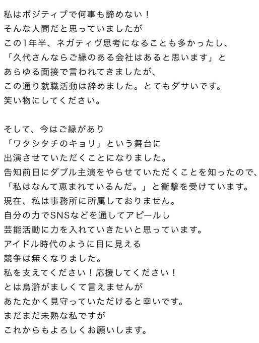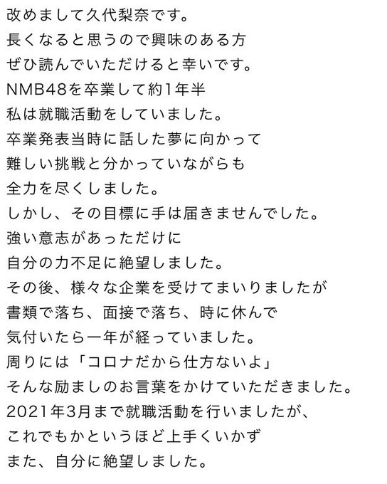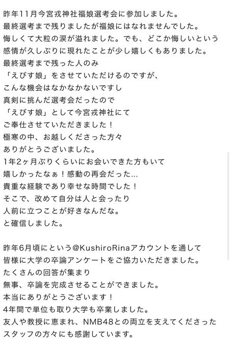 久代梨奈@Rina_Kushiro_ -- NMB48を卒業してから現在までそしてこれからのことを文章にしました📝長いですがよかったら読んでください🌱そして、これからもよろしくお願いします🙇🏻♀️ pic.twitter.com/kD7RTcgOcN