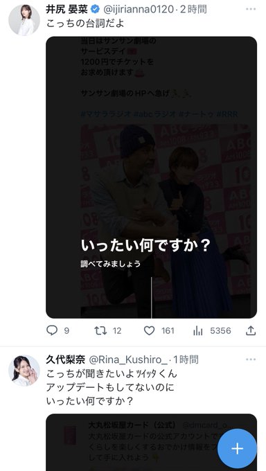 加藤夕夏@u_ka0801 -- 同期の同じツイート並んで出てきたw@ijirianna0120 @Rina_Kushiro_ pic.twitter.com/JcLWwTLsKf 井尻 晏菜@ijirianna0120 -- @u_ka0801 @Rina_Kushiro_ 流石www 加藤夕夏@u_ka0801 -- @ijirianna0120 @Rina_Kushiro_ なんで2人ともちょっと怒ってるん😂笑った😂 久代梨奈@Rina_Kushiro_ -- @u_ka0801 @ijirianna0120 まさか同じツイートしてたとは!!ウケる😜🤣