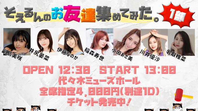 井尻 晏菜@ijirianna0120 -- 24日はお友達のそえるんさん家(?)にお邪魔します🥰!手土産忘れないようにしなきゃ() twitter.com/muse_enterpris… ミューズエンタープライズ【公式】@キャンペーン中♪ 【副島美咲イベント情報】今週末4月24日は「そえるんのお友達集めてみた。」開催です!1部トーク開場12:30〜 開演13:00チケットは下記よりご購入いただけます!tiget.net/events/127351 pic.twitter.com/LI29pBNTba