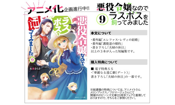 井尻 晏菜@ijirianna0120 -- !?!!?!!🙏😭✨✨✨ twitter.com/nagasesarasa/s… 永瀬さらさ 🎉アニメ化企画進行中🎉【2021/10/1発売】『#悪役令嬢なのでラスボスを飼ってみました』9(角川ビーンズ文庫様)WEB掲載中の番外編が書籍化されました!(画像参照)アニメ化企画も進行中です🙌✨詳細は今後随時公開されていきますので、公式サイトなどのチェックをお願い致します🌸 pic.twitter.com/HChugokKTj