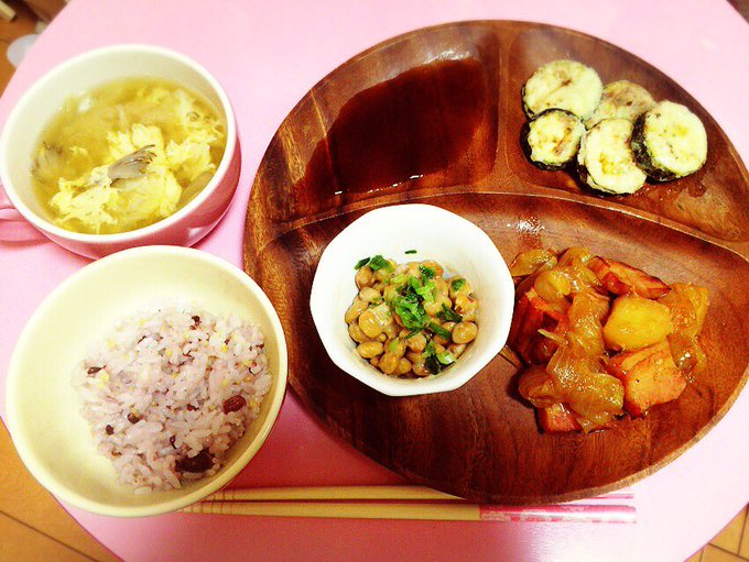 卵と舞茸とキャベツのお味噌汁、納豆、洋風肉じゃが、ズッキーニの唐揚げ的なやつ、雑穀ごはん。