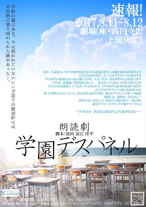 今出舞@m_bigbaby -- よろしくお願いしますっ! twitter.com/office54_/stat… Office54公式ー舞台「47男子」等 制作部よりお知らせです!お待たせいたしました!!本日12:00より朗読劇「学園デスパネル」の一般予約販売が開始されます。間もなく開始!チケットはこちら↓カンフェティ confetti-web.com/deathpanel 皆さんのご予約をお待ちしております! pic.twitter.com/Wt7itfzb7U