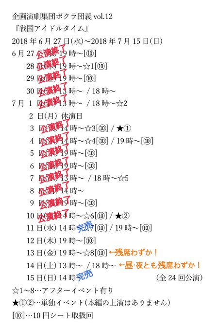 今出舞@m_bigbaby -- 観れるチャンスはあとちょっとしかないよーー!!! twitter.com/bokura_dangi/s… 企画演劇集団ボクラ団義 【#戦ドル 残席僅か】本日で残り五日、七公演となりました!・千秋楽15(日)→満席!・13(金)・14(土)13時/18時とも→残り数席!ご観劇のチャンスは≪今日11(水)19時≫≪明日12(木)19時≫の2回です!!今日、そして明日迷わず浅草九劇へ❗️お待ちしています!#ボクラ団義#浅草九劇 pic.twitter.com/quksQ1iqlc
