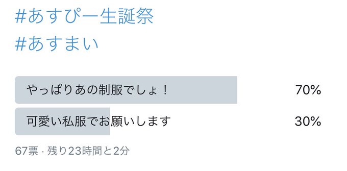 今出舞@m_bigbaby -- お!制服着るみたいです!!楽しみ💓💓 twitter.com/asu_pi/status/… 高橋明日香(あすぴー) アンケートたくさん投票してくれてありがとう!!!わたしが投票期間を間違えて長くしすぎたので(笑)もう結果出しちゃうね😊7割の人が制服って意見だったので制服にしますー💕ご意見ありがとう!#あすぴー生誕祭#あすまい twitter.com/asu_pi/status/… pic.twitter.com/aWtBqjciBC