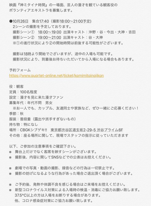 今出舞@m_bigbaby -- エキストラ募集です!私も出演するシーンがあるので、もし良かったらご参加ください😊💓 twitter.com/bokura_dangi/s… 企画演劇集団ボクラ団義 漫才を観ている観客役のエキストラを募集致します!!【#神ミタイナ時間 エキストラ募集】[ご予約方法]ご予約開始 10/18(日)12時〜予約URLquartet-online.net/ticket/kamimit…詳細は添付の画像をご覧下さい!ご応募お待ちしています!#ボクラ団義#映画#エキストラ募集 pic.twitter.com/7O6k2uWOsy