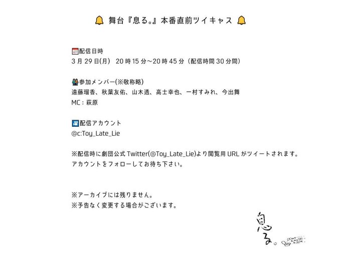 今出舞@m_bigbaby -- #舞台息る 順調に稽古してるよー!29日にツイキャスするから観てね❤️ twitter.com/toy_late_lie/s… ToyLateLie \公演恒例‼️/#舞台息る 公演直前ツイキャス📺🗓3/29(月)20:15~20:45✍️出演(MC:萩原)遠藤/秋葉/山木/高士/一村/今出脚演:萩原と客演の皆様との公演直前トークを是非ご覧下さい🎶※アーカイブは残りません。このアカウントから閲覧URLがツイートされますのでフォローしてお待ち下さい。 pic.twitter.com/KCuidL0Htm