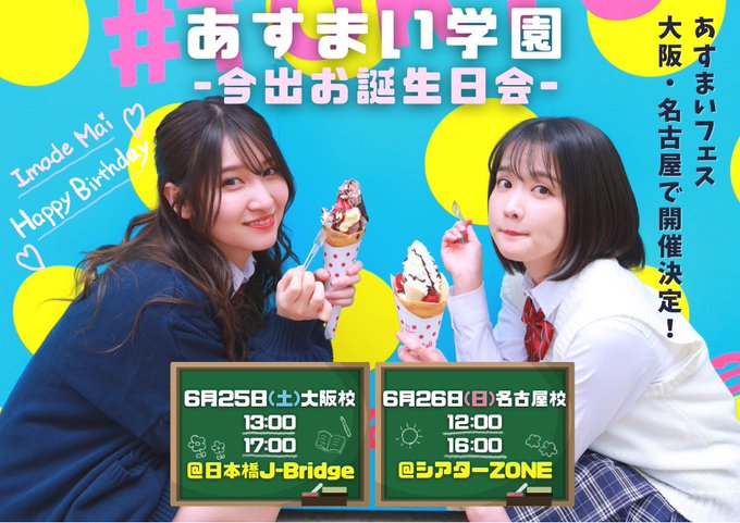 今出舞@m_bigbaby -- ご予約待ってますー!! twitter.com/asumaiofficial… あすまい公式アカウント あすまいフェスvol.5『あすまい学園〜今出お誕生日会〜』🗓6月25日(土)📍 Sound Bar J.Bridge (大阪)🎫tiget.net/events/185264🗓6月26日(日)📍シアターZONE(名古屋)🎫 tiget.net/events/185271ついに大阪、名古屋で開催決定🎉絶賛ご予約受付中です🥰#あすまいフェス#あすまい pic.twitter.com/dVy4XxgY4c