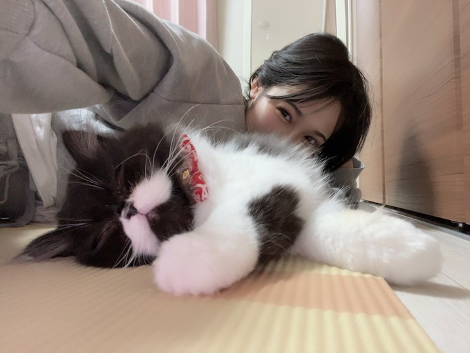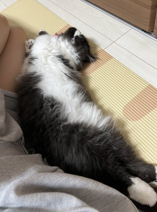 今村麻莉愛@maria_0914_ -- おやすみなさい〜🥱筋トレしようとストレッチマットに寝っ転がった瞬間にふくまるが隣で寝ちゃったので今日はお休みします🐱笑 pic.twitter.com/xh9Vva808K