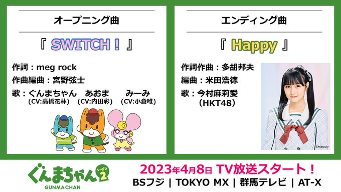 今村麻莉愛@maria_0914_ -- シーズン2も続けてED曲はHappyみたいです!嬉しい~💭💞 twitter.com/gunmachan_info… ぐんまちゃん公式情報 🌈『ぐんまちゃん』シーズン2📢【OP曲】&【ED曲】のお知らせシーズン1から続投‼️🎵OP曲『SWITCH!』🎵ED曲『Happy』シーズン2でもお楽しみください❣️ちなみに映像は新規制作です🖌️ぜひ放送をご覧ください✨#アニメぐんまちゃん#高橋花林 #内田彩 #小倉唯#今村麻莉愛 pic.twitter.com/ITzhJSCprb