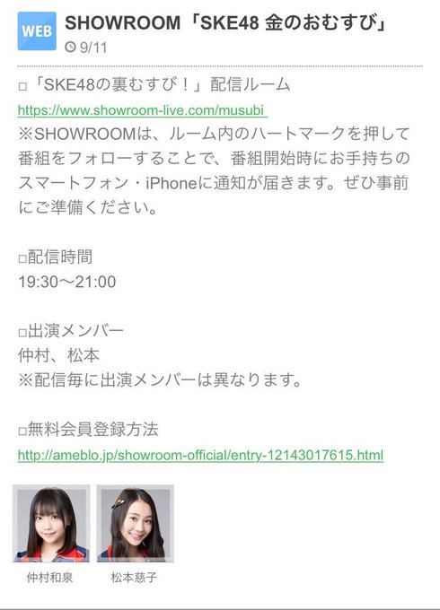 松本慈子@chikako_1119 -- みんなー!みーてーね❤️ twitter.com/izurin_ske48/s… 仲村 和泉(SKE48) SHOW ROOMありがとうございました😊明日19時30分からは、ちかこさんと金のおむすびです🍙みんな見にきてね⭐️ pic.twitter.com/wGL8sWRtQp