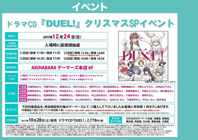 仲谷明香(なかやさやか)@nkysyk_a -- 3部最初の方あんまり出ないので、4部に来て欲しいなー笑 twitter.com/duel_cd/status… 🎄本日🎄クリスマスSPイベント🌟ドラマCD 『DUEL!』🌟 🌟本日クリスマスSPイベント開催🌟第1部 開場11:00/開演11:30第2部 開場13:30/開演14:00第3部 開場16:30/開演17:00第4部 開場19:00/開演19:30★全ての部 当日券出ます‼️AKIHABARAゲーマーズ本店6F(秋葉原駅より徒歩1分)gamers.co.jp/event/79973/ gamers.co.jp/event/79412/ pic.twitter.com/OhAyUJWhAw