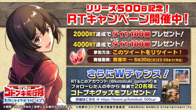 仲谷明香(なかやさやか)@nkysyk_a -- 500日記念!めでたい…!皆さん是非! #コトブキ twitter.com/kotobuki_gamep… 荒野のコトブキ飛行隊 大空のテイクオフガールズ!【公式】 【🥞リリース500日記念!RTキャンペーン開催中🥞】500日を記念し、RT達成でダイヤ最大200個プレゼント!さらにWチャンス✨このツイートをRT&本アカウントをフォローで抽選で20名様にコトブキグッズプレゼント!6月30日(火)23:59まで(予定)詳細⇒bnent.jp/kotobuki_500cp/#コトブキ pic.twitter.com/xjFShFpzeR