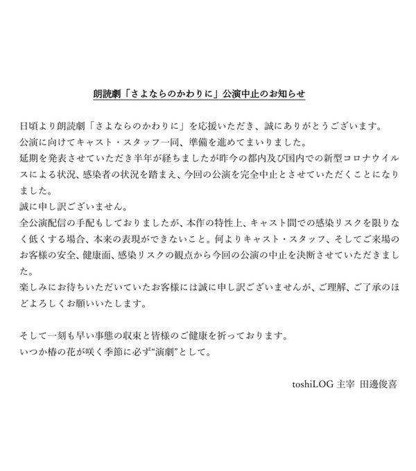 仲谷明香(なかやさやか)@nkysyk_a -- 公演延期を発表しておりました、朗読劇「 #さよならのかわりに 」公演中止が発表されました。とても悲しいのですが、また沙知を演じられる日が来ることを願っています。 twitter.com/log_toshi/stat… toshiLOG 【公演中止につきまして】朗読劇「さよならのかわりに」コロナウイルス感染症に伴い、関係各所と開催に向けて協議を重ねておりました結果、本公演の中止についてご報告致します。ご確認頂けますと幸いです。よろしくお願い致します。#さよならのかわりに pic.twitter.com/cpTHYaCDWV