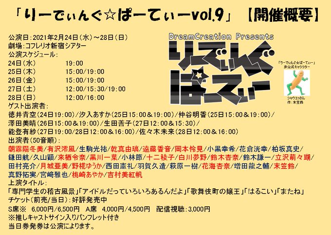 仲谷明香(なかやさやか)@nkysyk_a -- #りーでぃんぐぱーてぃー配信が決定しました!劇場に来られない方も是非、配信でお楽しみ下さいませ✨仲谷は25日の2公演にお邪魔します☺️ twitter.com/dream_c_info/s… ドリームクリエイション 「りーでぃんぐ☆ぱーてぃーvol.9」本番まで2週間。全10公演、配信決定!各公演ともに生配信+1週間のアーカイブ配信となります。12日19時より配信チケット発売!配信チケットお求めは↓s.confetti-web.com/detail.php?dir…購入・視聴方法はこちら↓confetti-web.com/guide/streamin…#りーでぃんぐぱーてぃー pic.twitter.com/r8kHxVUs8b
