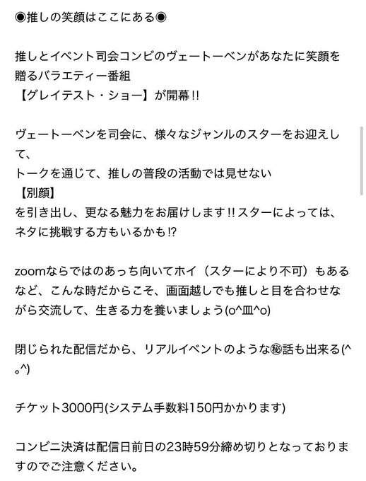 本日3/19(土)、ヴェートーベンさん司会のトークバラエティーに出演致します。二部制で一部はトーク、二部は企画メイン!