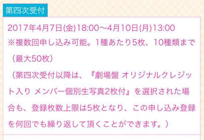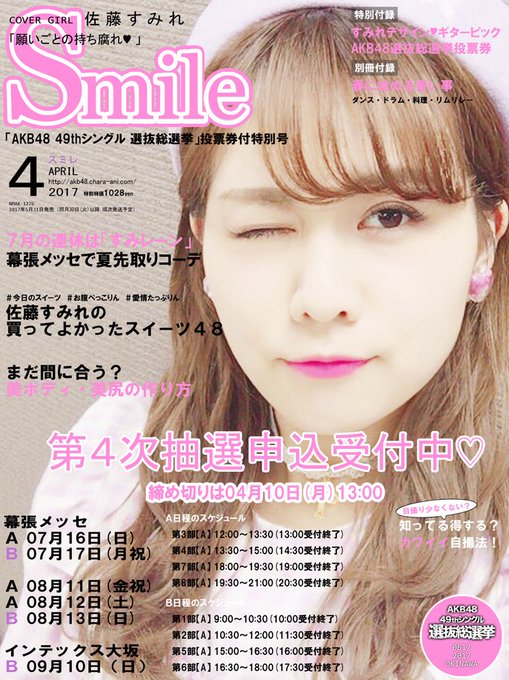佐藤すみれ@sumire_princess -- 今年も立候補しました。よろしくお願い致します!♡ twitter.com/sumire_electio… 佐藤すみれ総選挙応援2017 総選挙投票券付きCD 「願いごとの持ち腐れ」4次申込み受付中です🌸明日10日(月)13時まで!今回から複数回申込み可能です。例年、選挙シングルは早めに完売枠が出る傾向にありますので、ご確認よろしくお願いします🌟akb48.chara-ani.com pic.twitter.com/9NLbxHyYKB