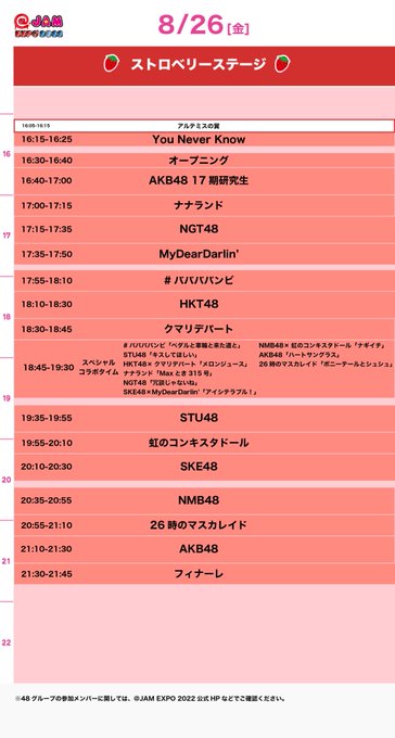 佐藤佳穂(SKE48)@BCNOkaho -- SKE48は20時10分〜です🥰配信もあるみたいだよ〜かほのこと見つけてね❣️🤍 #アットジャム #SKE48 8月26日スペシャルデー twitter.com/at_jam/status/… @ JAM シリーズ公式 【最終出演者&タイムテーブル公開】8/26.27.28 横浜アリーナ@ JAM EXPO 2022お待たせしました、最終出演者とタイムテーブル発表です‼️また、ステージ企画も発表✨スペシャルな企画もどうぞお楽しみに🎶詳細はコチラ⇒atjam.jp/news/detail/Y3…チケット:atjam.jp/expo2022/ticket#アットジャム pic.twitter.com/wY6HcJxtvS