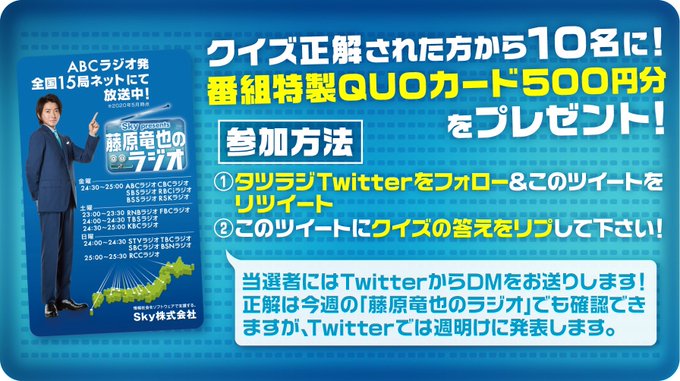 🍀佐藤実絵子🍀@mieppp624 -- 答えはA!!!👻 twitter.com/tatsuradio1008… 藤原竜也のラジオ タツラジクイズ📣今週のゲスト、事故物件住みます芸人の松原タニシさんは現在国内で複数の事故物件を借りているそうです…🏠😱🏠を借りてない都道府県はどこ?A.北海道B.大阪C.沖縄正解者の中から10名に番組QUOカード500円分プレゼント!〆切⇒8/21(金)18時リツイートも🙏✨詳細は👇 pic.twitter.com/Lk9iVw5uFm