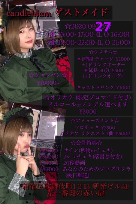 佐藤 栞@B00kmarker_nii3 -- 営業時間が1部 15〜18時2部 19〜22時に変更になりました‼️よろしくお願いします🥺 twitter.com/b00kmarker_nii… 佐藤 栞 9月27日(日)に開催できることになりました‼️時間、システム等は変わりません🙆♀️また @__candleblum__ にDMで予約をお願いします💓(名前と、何名で何部の何時からどのくらい滞在するか明記してください!) pic.twitter.com/NiKE4Okjbx
