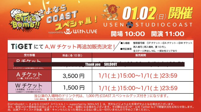 佐藤 栞@B00kmarker_nii3 -- 新年最初のライブ❣️あけおめしよ〜🐯💓 twitter.com/tsunasta_ofc/s… 刹那的アナスタシア【公式】 【🐯新年1発目🎍】『Girl'sBomb!! さよならCOAST スペシャル! 』1/2(日)USEN STUDIO COAST①ラウンジステージ🎤ライブ13:25〜 特典会13:55〜1②野外ステージ🎤ライブ18:15〜 特典会19:10〜d🤝お目当て特典:あけおめ20〜22秒動画🎥本日15時〜追加販売!!🎟 tiget.net/events/162875 pic.twitter.com/CSplTDhQuV