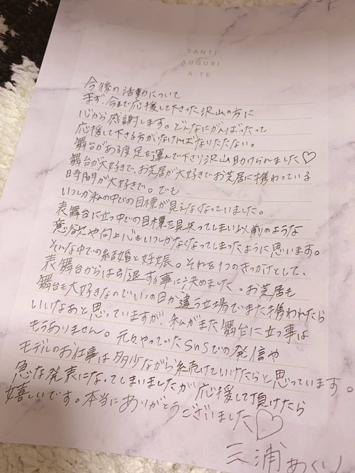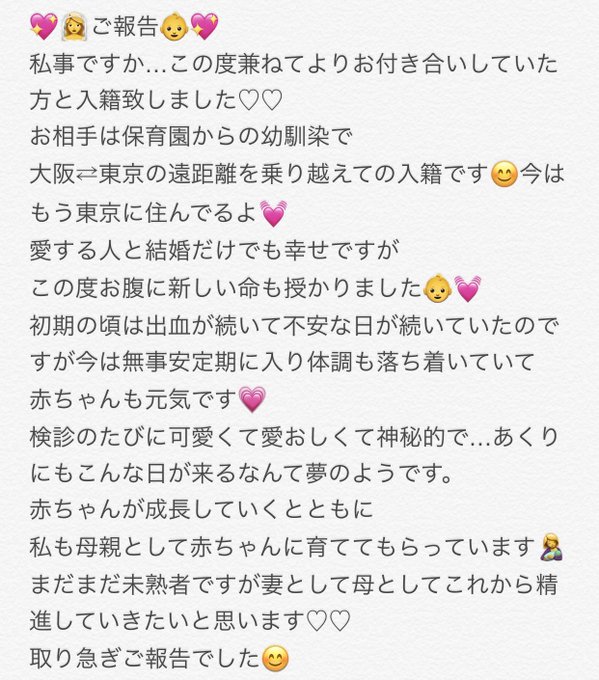 佐藤聖羅@0430seira -- おめでとうー💖💖🎉🎊 twitter.com/akuri_miura/st… 三浦あくり 💖👰ご報告です👶💖結婚しました…♡そして…♡取り急ぎのご報告なのでまたゆっくりお話していければと思ってますが、是非目を通して頂けたら嬉しいです😌 pic.twitter.com/oNdSrvlOg7