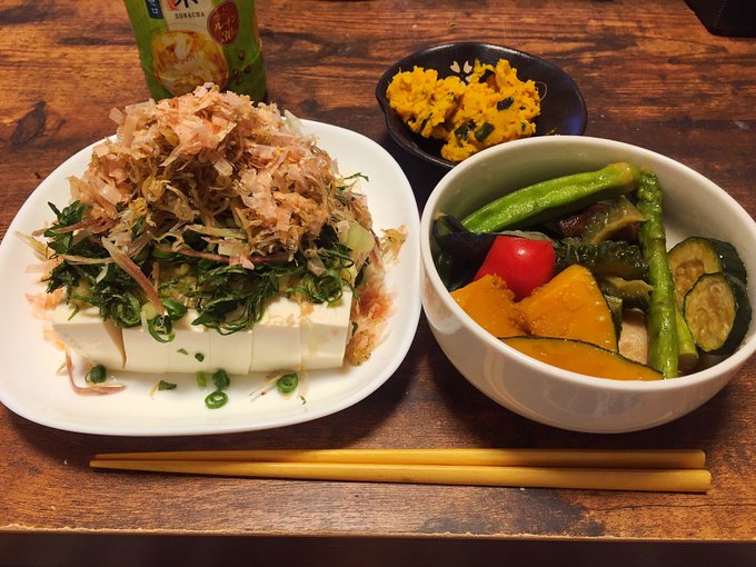 夜ご飯💖薬味多すぎ奴っこ10種の夏野菜揚げ浸しかぼちゃサラダ酒が飲めたら最高よ✨✨でも私はそば茶。。。笑 pic.twitter.com/QdHOoH1MMv