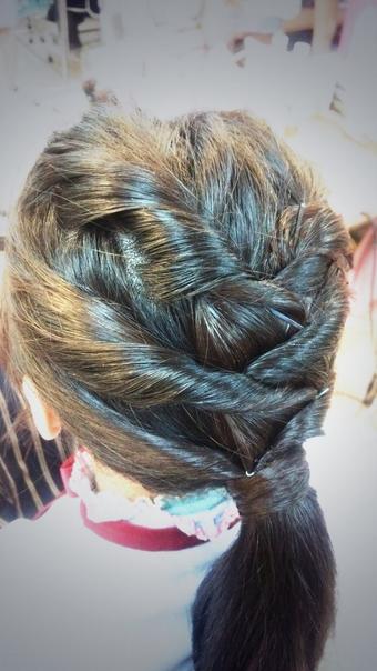 ポニーテールに見えるけど、実は後ろがこんなに複雑にねじねじしてあるアレンジまとめ髪だったの(((o(*゚▽゚*)o))) pic.twitter.com/gvjXUNopjs