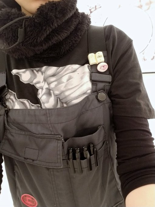 会期中のツナギスタイル、ピラミッド下が空いていたので全て胸ポケットに収納していました