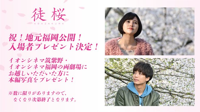 兒玉 遥@haruka_kdm919 -- 明日は地元福岡の映画館で舞台挨拶です🌸・イオン筑紫野・イオン福岡こうして凱旋でき嬉しく思います!是非お越しください☺️ twitter.com/adazakura_movi… 映画『徒桜』 公式 \福岡公開記念!入場者プレゼント決定!/映画の舞台である福岡公開を記念いたしまして、イオンシネマ筑紫野・福岡にご来場いただきました、お客様限定で本編写真をプレゼント!数に限りがありますので、なくなり次第終了となります。12日(金)は初日舞台挨拶も両劇場で開催!#徒桜#映画徒桜 pic.twitter.com/7WS3Bsd6Rm