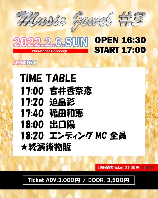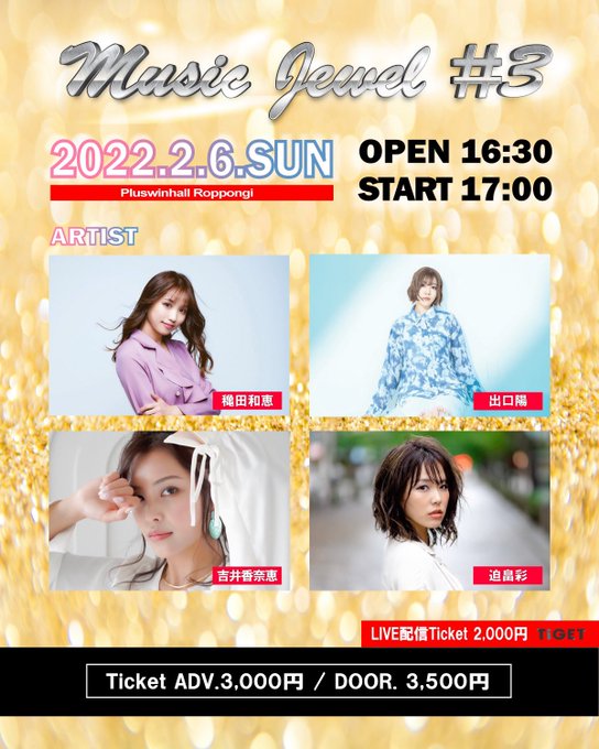 出口陽/aki@akisun314 -- 2/6(日)にライブ出演いたします!会場チケット、配信チケット共に販売中🎟よろしくお願いします☺️🍀 twitter.com/aki_staff/stat… 出口陽 STAFF 【ライブ出演】チケットサイトに繋がらず申し訳ございません🙇♀️こちらから再度よろしくお願いいたします。2/6(日)開演 17:00/開場 16:30会場:Pluswinhall Roppongi前売り ¥3000 当日 ¥3500配信 ¥2000チケット予約▶︎ tiget.net/events/166587配信チケット▶︎ tiget.net/events/166588 pic.twitter.com/DtCNxPWxgu