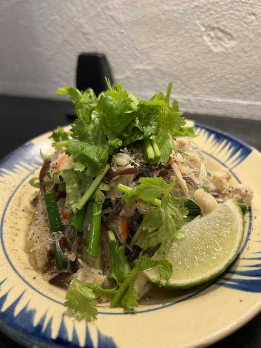 上に乗っとる葉っぱがパクチーなのかハーブなのかわからんだけど美味しすぎた....アジアン料理大好き🙏💖