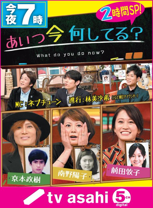 前田敦子@Atsuko_100 -- 本当に楽しくて嬉しい収録だったよ!みてねかお twitter.com/tv_asahi_pr/st… テレビ朝日宣伝部 夜7時から「あいつ今何してる?2時間SP」!#京本政樹 寡黙な同級生と39年ぶりの再会!友情を物語る思い出の品登場に感動…#南野陽子 本命じゃないけど告白した相手と再会!?#前田敦子 初告白!初恋の相手と再会で超赤面!そして『芸能人になりたいと思った』キッカケの人物が登場! pic.twitter.com/QHtQUva06v