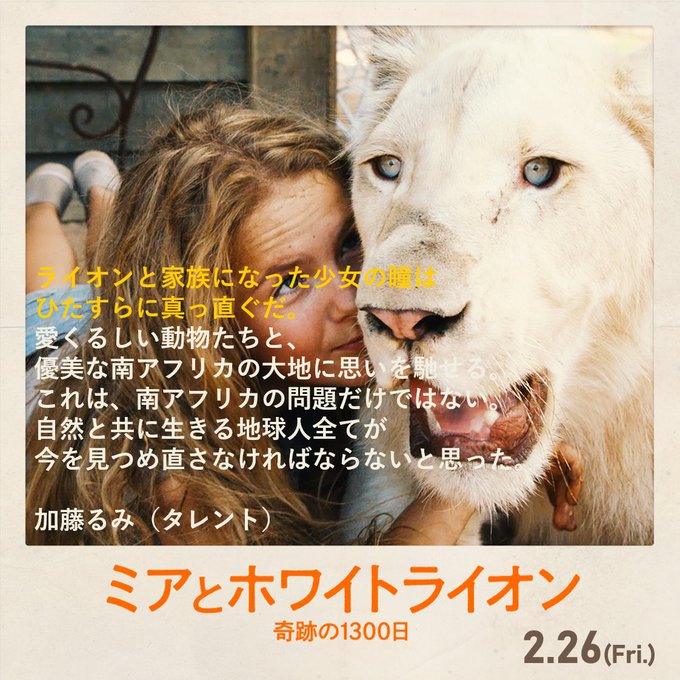 最近では『ライオン・キング』など、本物さながらのCGの表現力には驚きますが、この映画はCGは一切ナシ!本物のライオンの迫力、可愛さが堪能できます。ライオンと少女の愛くるしいやりとりに必見です! pic.twitter.com/FFweUHKdvR