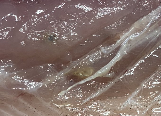 昨日横須賀で釣ったサバ、その場ですぐに締めて内臓を取り出したのに筋肉の中にかなりの数(20以上)のアニサキスが!