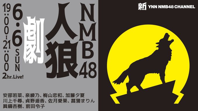 加藤夕夏@u_ka0801 -- 本日19時から!!🐺🐾始まるで!!!!とりあえず見てくださーい😳😏#新YNN twitter.com/riichan24h/sta… 新YNN NMB48 CHANNEL #新YNN 6/6(日)19:00-21:00「NMB48人狼 劇」出演: 安部若菜、泉綾乃、梅山恋和、加藤夕夏、川上千尋、貞野遥香、佐月愛果、菖蒲まりん、眞鍋杏樹、前田令子いつもと違う感じかもしれません。ch.nicovideo.jp/ynn pic.twitter.com/a3OgGF4IFX