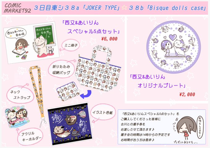 ちびあいりん(古川愛李)@chibiairin_f -- コミケ情報こちらでも!西又先生とちびあいりんコラボ🎵よろしくお願い致します🎵🎵 twitter.com/black_rin2/sta… 古川愛李(女の子描く用) ★夏コミ情報★西又葵先生との合同セットのお品書きです♪全部可愛くて嬉しいーーーー♪♪「スペシャル5点セット」には握手券が、、、(゚Д゚)お暇な方は是非遊び来てやってください(>_<)よろしくお願い致します♪#C92 pic.twitter.com/HQG8msmA1l