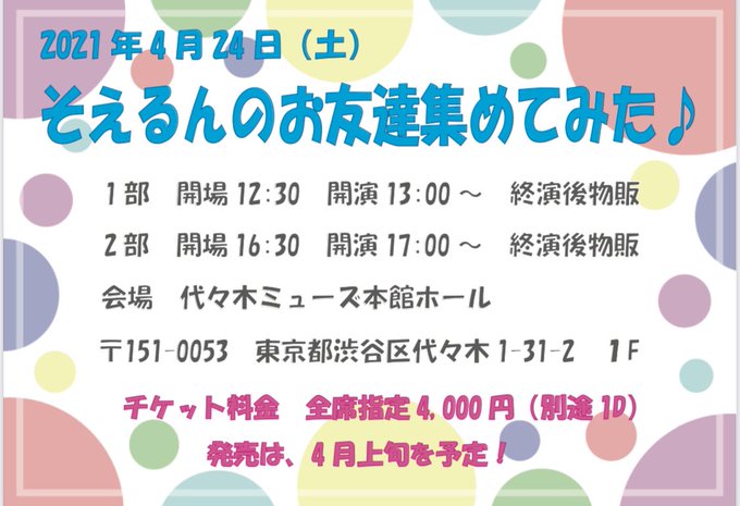 名取稚菜@wakana__67 -- 美咲主催という事で即答で出るって言いました😇4月24日会えるのを楽しみにしてます🌟 twitter.com/muse_enterpris… ミューズエンタープライズ【公式】 【副島美咲イベント情報】4月24日(土)「そえるんのお友達集めてみた♪」☆現在決定の出演者様☆ (敬称略、順不同)1部 名取稚菜 小田あさ美 川井優沙2部名取稚菜 小田あさ美 開坂映美順次情報更新いたします!どんな楽しいイベントになるかぜひお楽しみに! pic.twitter.com/Q75g6rPvwG