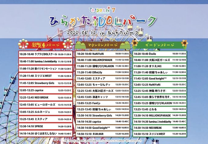 6/12(日)のひらかたパークでのライブのタイムテーブルがでました🎢🎠✨