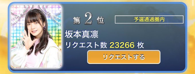 坂本真凛(SKE48)@marin_ske48 -- 予選の速報 2位✨びっくりした!ありがとうございます( ;ᵕ; )♡予選なのでみなさん本戦のときの力を残しつつ引き続き、ぽちぽちよろしくお願いします!!#P4U #CM選抜2020 pic.twitter.com/mNccKlfvZ0