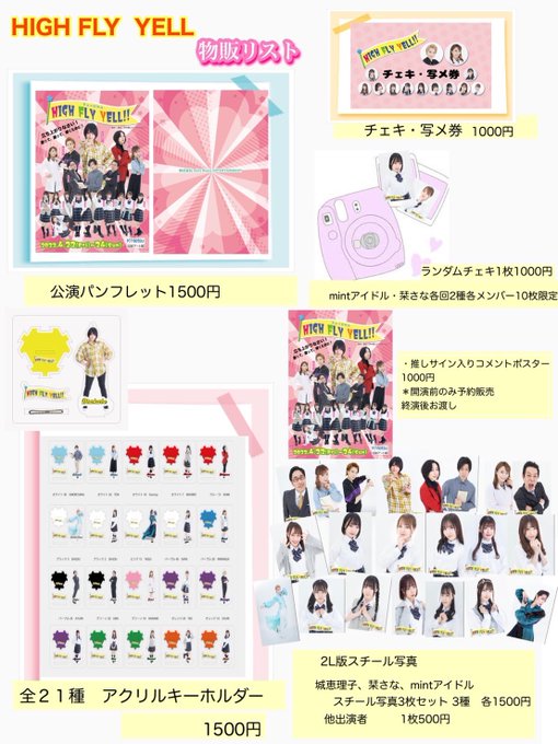 城 恵理子@erikonnitiwa11 -- こんちは〜みんな〜物販だってさ🫣自分がアクリルキーホルダーになってるのなんて久々に見ました😂😂今回しかゲットできないのでみなさん良かったらゲットしてください✊🏻✊🏻 twitter.com/highfly_yell/s… HIGH FLY YELL!! #HIGHFLYYELL の公演中の物販リストです⭐️当日劇場でしか買えないモノです‼️パンフレットは写真が沢山⭐️でとっても可愛いですよ💕出演者とのツーショットチェキ写メ券は物販でご購入頂き、終演後列にお並び下さい😊 pic.twitter.com/ad4zAUBrzL
