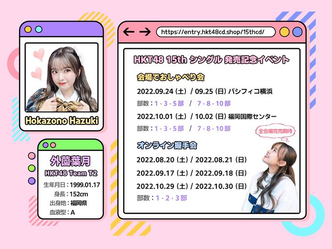 外薗葉月☺︎【HKT48】@hazuki___0117 -- 握手会第4次受付中です☺︎entry.hkt48cd.shop/15thcd/明日の14時までだよ〜会える機会増えて嬉しいなぁぜひ会いに来てね🌷 pic.twitter.com/17QhiF3x9N 外薗葉月☺︎【HKT48】@hazuki___0117 -- 今日の14時までです☺︎