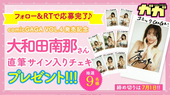 大和田 南那@Nana_Owada728 -- 簡単なので是非参加してチェキ当てちゃって下さい~!私もしっかり参加😆✌🏻 twitter.com/comicgaga/stat… comicGAGA(コミックガガ)編集部 // #comicGAGA(コミックガガ) VOL.4直筆サイン入りチェキプレゼント✨🎁🎁✨\\🖊️大和田南那ちゃん🖊️の直筆サイン入りチェキが9名様に当たるキャンペーン中‼️■応募簡単!① @comic_GAGAと@Nana_Owada728をフォロー❗️②このツイートをRT【7/1迄】③当選連絡はDMで📩 pic.twitter.com/CHoPMGbaRX