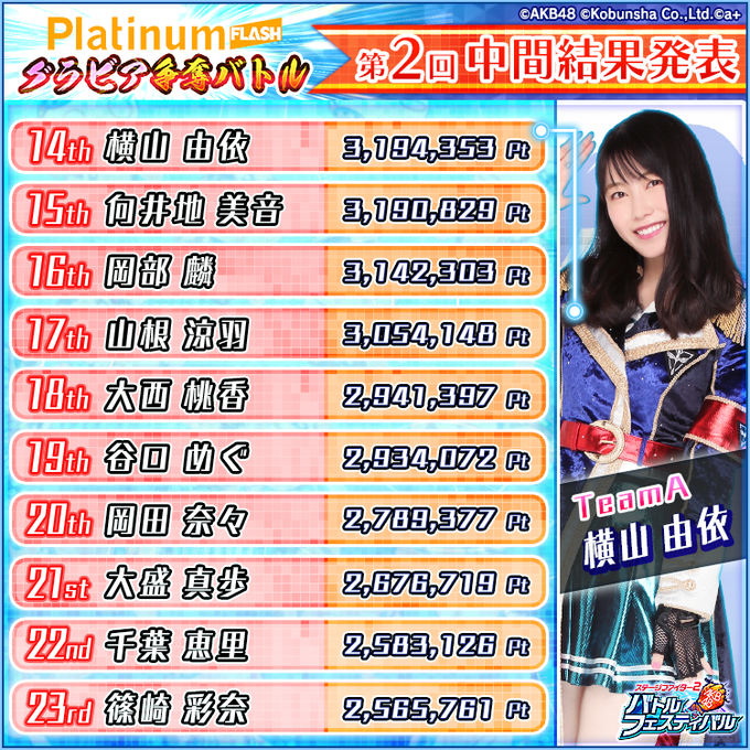 大西 桃香@momo_0x0_920 -- わ!嬉しい〜😳✨ありがとうございますっ😭❤️ twitter.com/akb48_battlefe… バトフェス(バトルフェスティバル) 【Platinum FLASHグラビア争奪バトル第2回中間結果発表❗】大好評開催中のPlatinum FLASHグラビア争奪バトルにつきまして14位~23位の中間結果発表についてご案内いたします。詳細はゲーム内お知らせもご確認ください。#AKB48 #バトフェス #PlatinumFLASHグラビア争奪バトル pic.twitter.com/jgWkAkH1KY