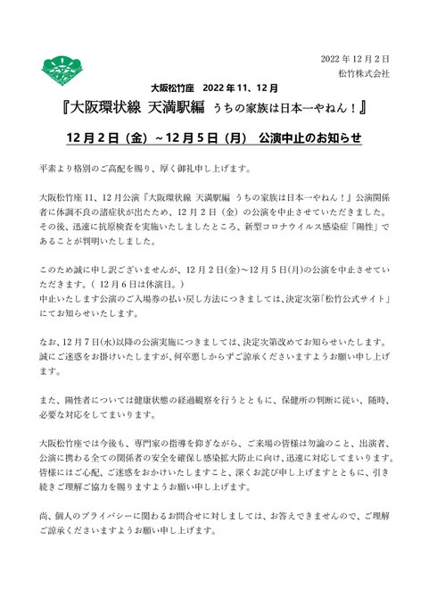 12月2日(金)〜12月5日(月) 公演中止のお知らせ